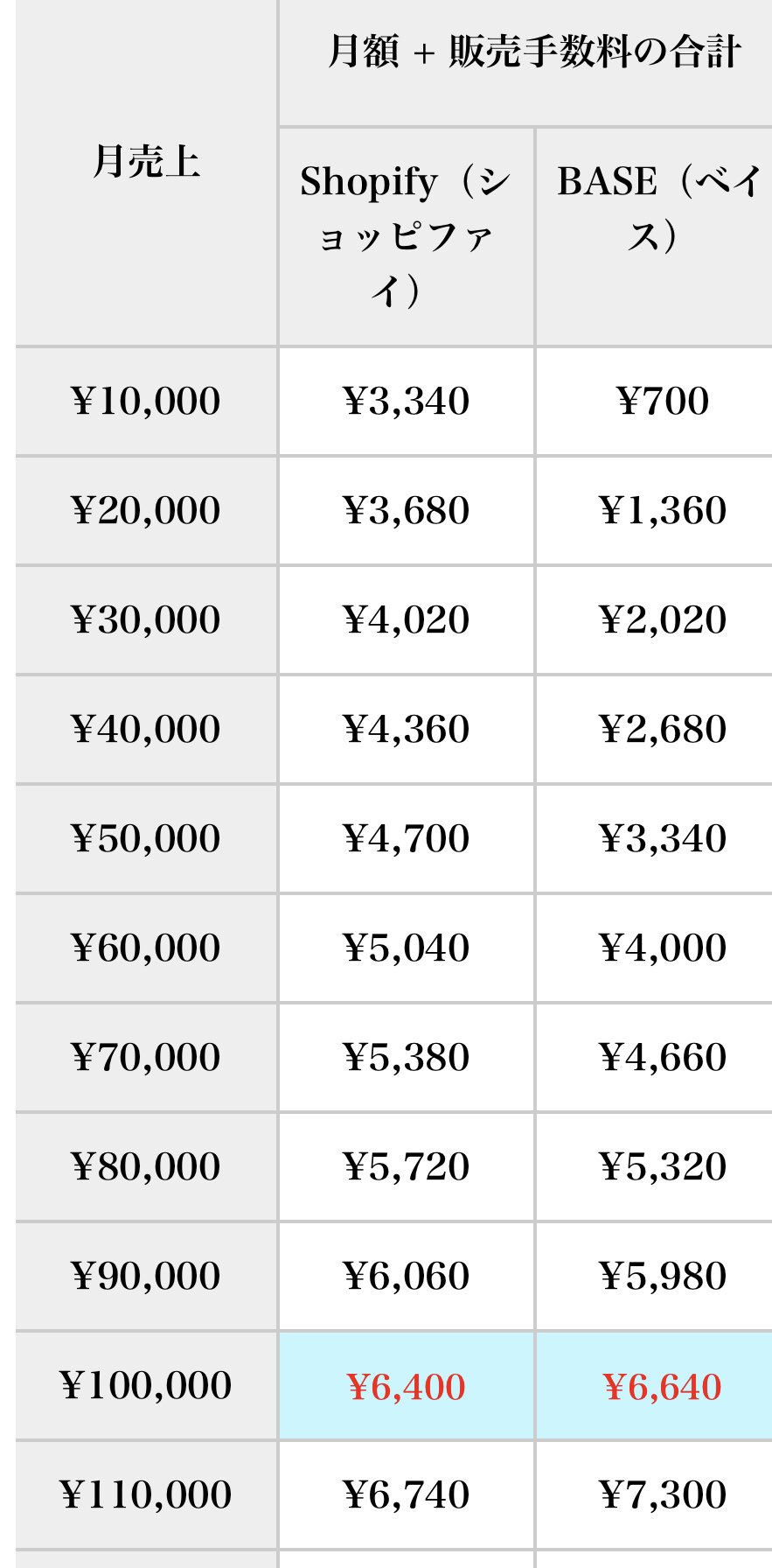 (baseとshopifyの月額コストが逆転するシミュレーション表↓)