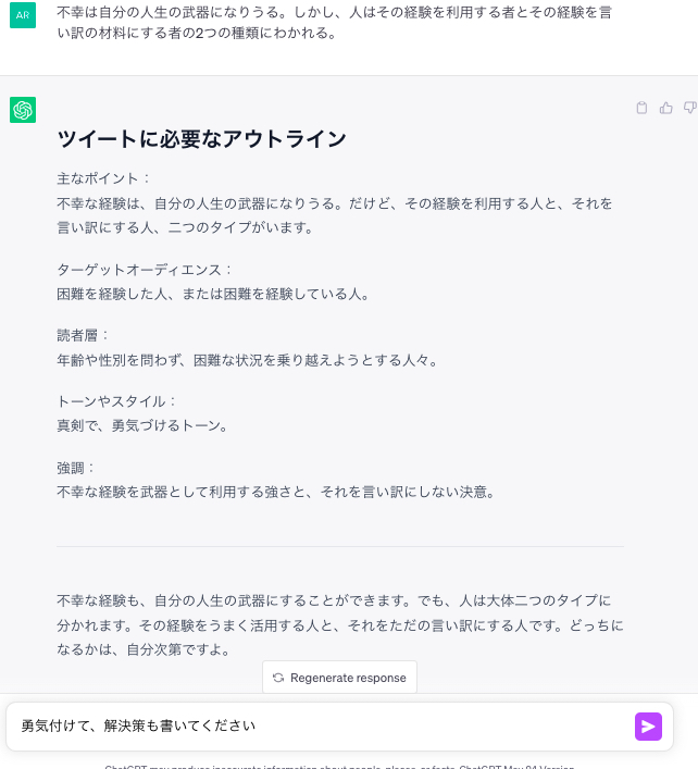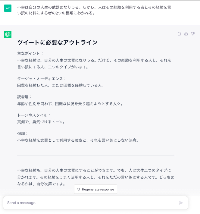 みたいな単純なテーマでさえツイートを作ってくれますが、より具体的なテーマを与えてあげた方が返答精度が高くなります。