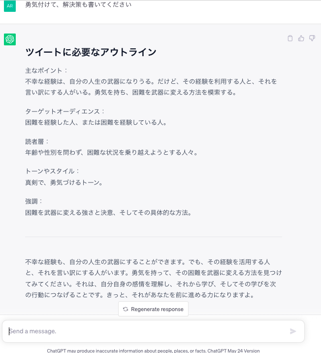 これだと解決策がないので、「勇気付けて、解決策も書いてください」と下の「send a message」の中にプロンプトを追加してみました↓