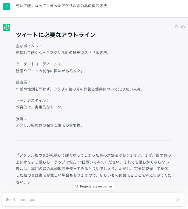 これだとチャットGPTに何をすればいいのか明確に伝わってないので当たり障りのない答えを返してきます。