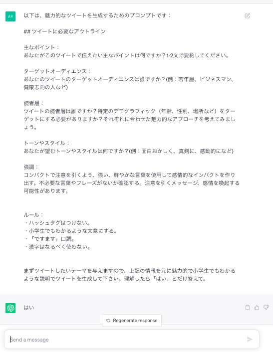・漢字はなるべく使わない。まずツイートしたいテーマを与えますので、上記の情報を元に魅力的で小学生でもわかるような説明でツイートを生成して下さい。理解したら「はい」とだけ答えて。