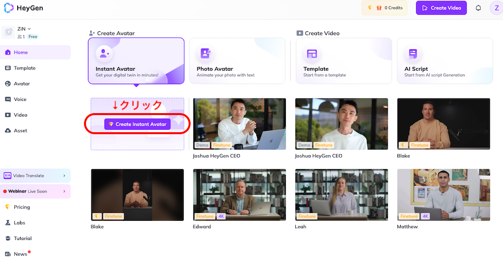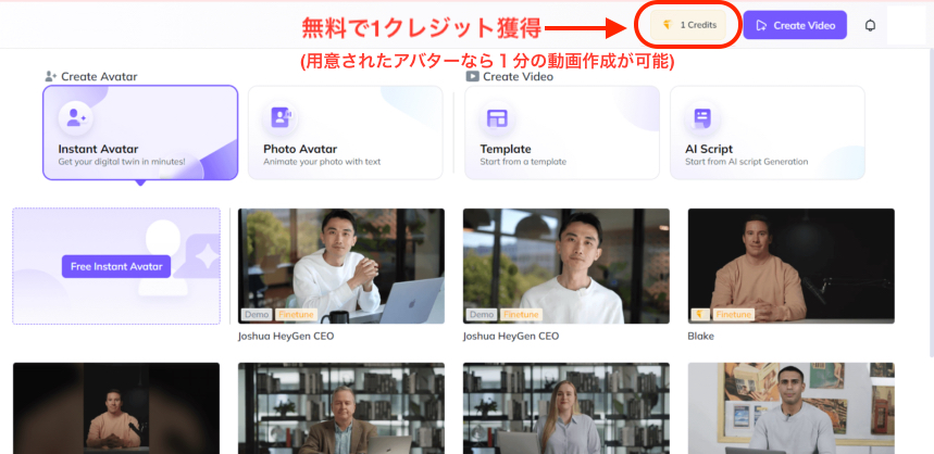 HeyGenへの登録が完了すると無料で1クレジットもらえます。