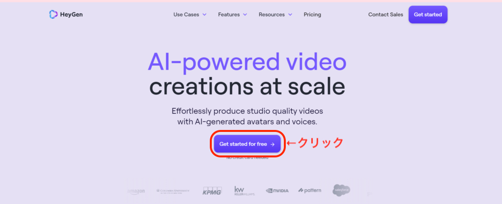 ①HeyGenの公式サイトにアクセスする。