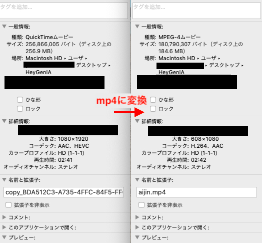MacだとiMovieで簡単に変更できます。iMovieに動画を入れて保存をするときに拡張子(形式)に「.mp4」と入れるだけ。