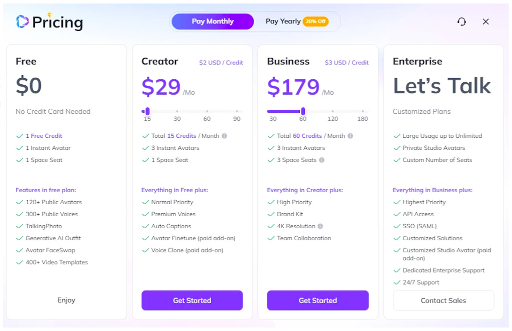 全プランで100以上の多様でカスタマイズ可能なアバター、40以上の言語で300以上の音声、自分のアバターの作成、個人の声の録音の統合が利用可能です。