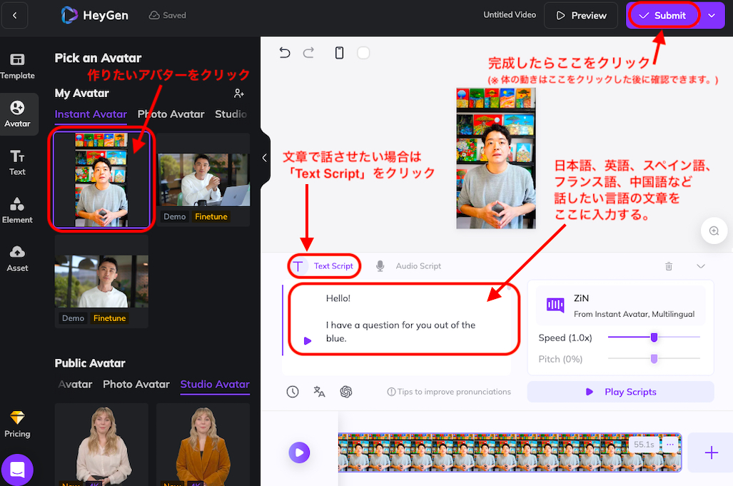 ここまできたら後はもの凄く簡単にアバター動画を作成することができるようになります。
