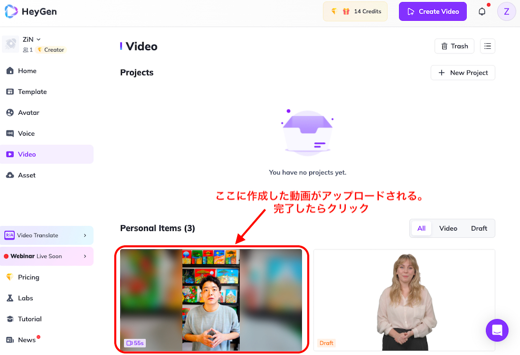 ③ アップロードが完了したら自分のアバター動画をクリック。