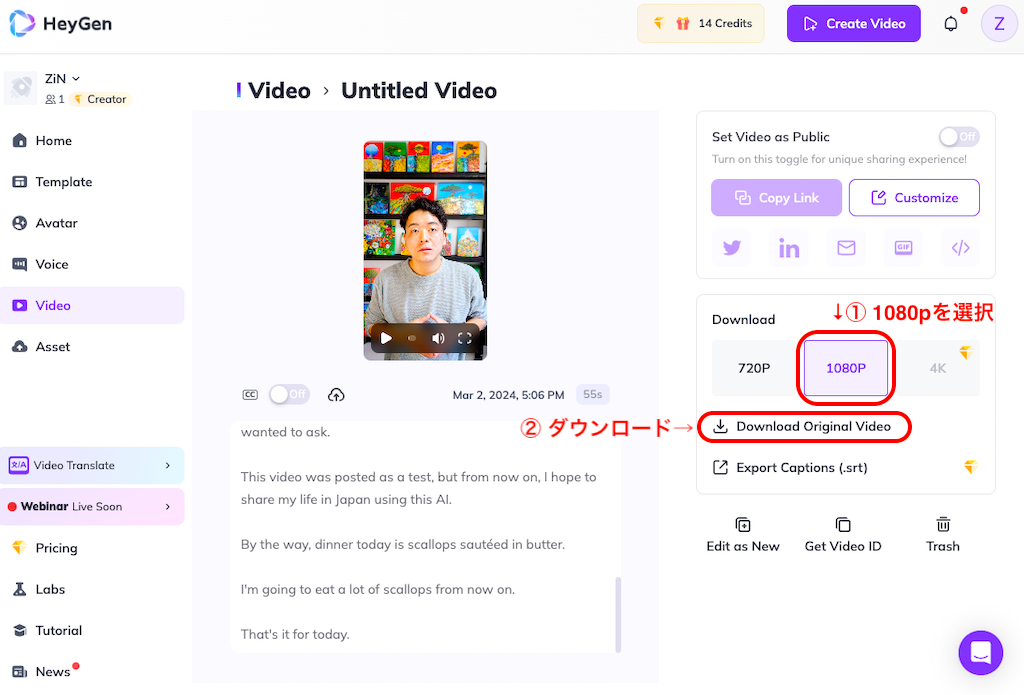 ④ 1080pをクリックした後に「Download Original Video」をクリックすると、お使いのパソコンに完成した動画がダウンロードされます。