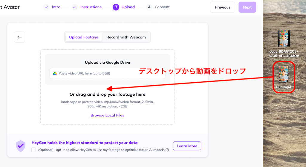 HeyGen公式サイトでは2分間のスピーチと明記してますが、2分以上〜5分の動画を登録することができます。