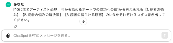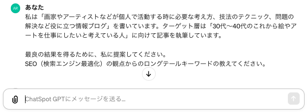 「ChatSpot GPTにメッセージを送る…」というメッセージ欄に下のプロンプトをコピーして貼り付け、次に上の②で得たロングテールキーワードから1つ選んで赤文字の部分に貼り付けます。↓
