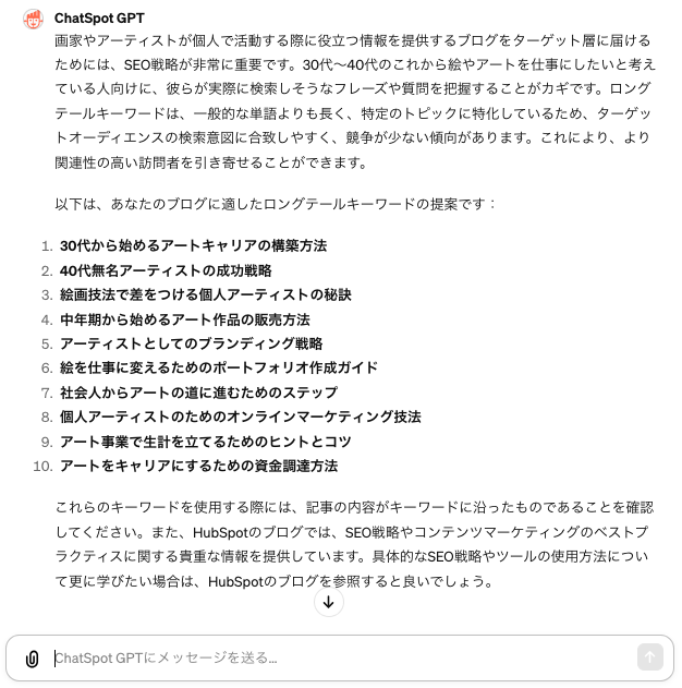 ② ChatSpotGPTがロングテールキーワードを出してくれる。