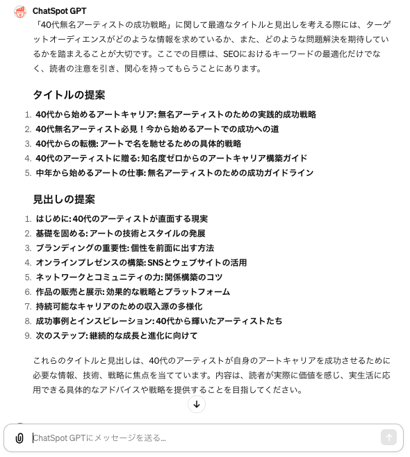 ④ ChatSpotGPTが「タイトルと見出しの提案」をしてくれる。