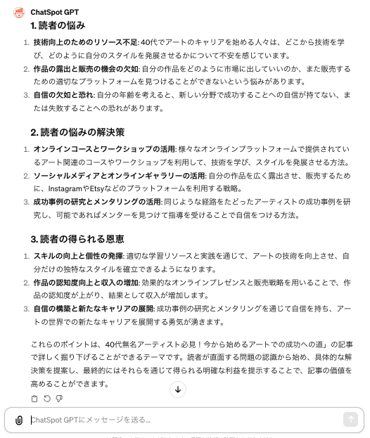 これらのポイントは、40代無名アーティスト必見!今から始めるアートでの成功への道」の記事で詳しく掘り下げることができるテーマです。読者が直面する問題の認識から始め、具体的な解決策を提案し、最終的にはそれらを通じて得られる明確な利益を提示することで、記事の価値を高めることができます。