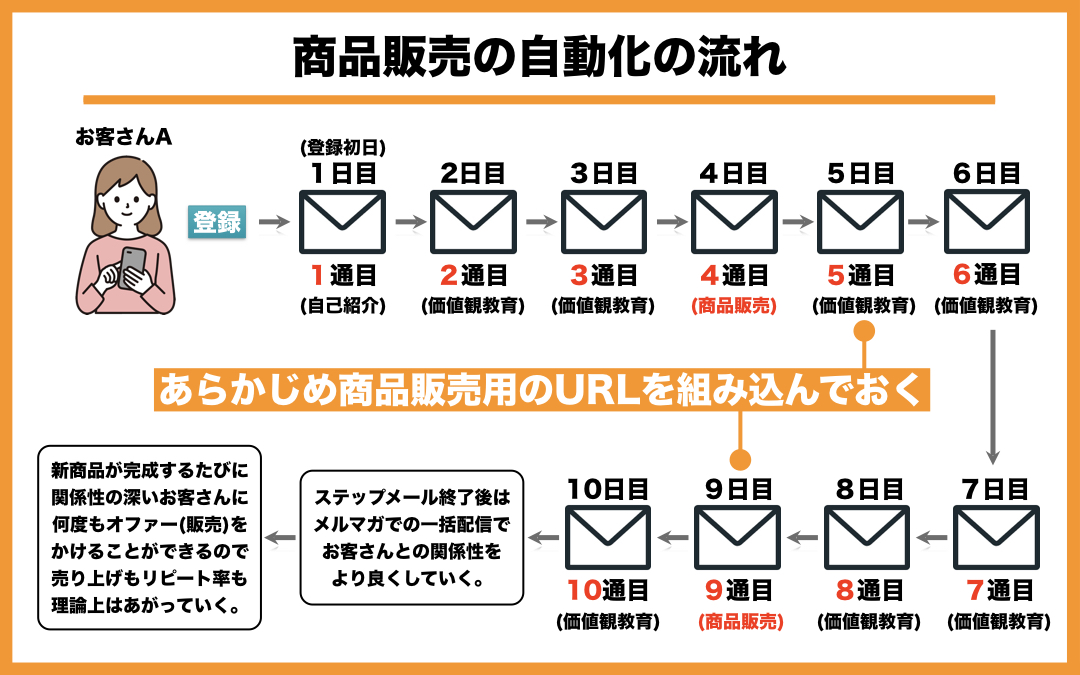 - 10通目以降→メルマガ配信をして関係性をさらに築いていきながら、たまに新商品販売。これの繰り返し。