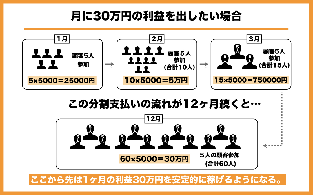 30万円稼ぐなら5000円の商品を60人の顧客から集める事が必要だとわかります。