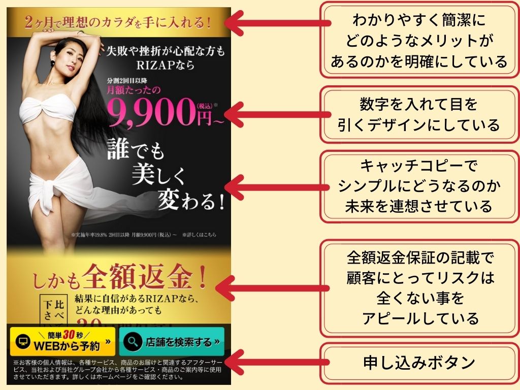 まず見てもらえるようにキャッチコピーを大きくしましょう。(そもそもキャッチコピーだけで良い場合もある)