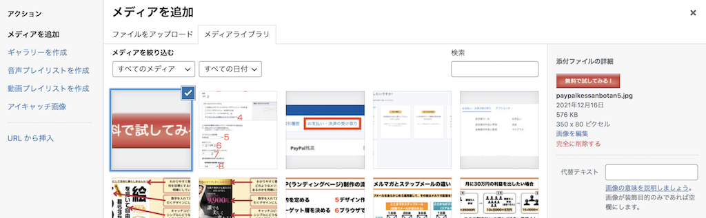 こうしたボタン画像を作成したら、ワードプレスのブログの「メディアを追加」→「ファイルをアップロード」→「ファイルを選択」から画像を入れて保存しておきましょう。(ようは普通にブログに画像を入れておくという事)