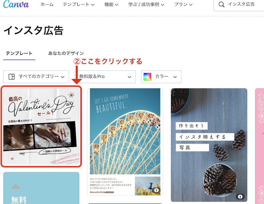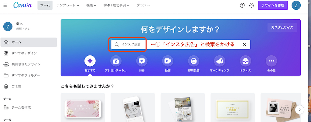 まずCanvaのトップページで「インスタ広告」と検索をかけます。