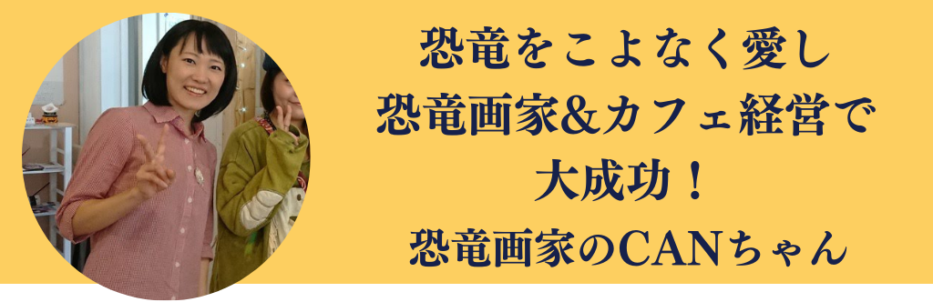 頻繁に飲みにいく仲になった恐竜画家のCANちゃん。大阪の難波でお絵かきアトリエカフェを経営して見事に成功しています。彼女は先ほど紹介した織田くんが開いたチル会(ラフな飲み会のようなもの)で出会ったのですが、彼女も僕の授業を受けており、彼女の向上心には脱帽するところがありました。笑ってこらえてに恐竜画家として出演したり、京都の東急ハンズやロンドンでの個展をしたり、瞬く間に成功への道を進んでいます。僕は毎年夏になると沖縄の座間味という島でキャンプペイントを開催するのですが、彼女もそこに訪れた時に一晩中今後の活動について話をしていました。側から見ても大成功をしている彼女を見ているとこちらまでやる気にさせてくれる。今後の活躍も楽しみです。